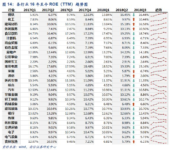 从行业的角度来看,2018Q3大多数申万一级行业ROE(TTM)出现下降,仅有建筑材料、采掘、通信和农林牧渔等少数行业环比出现改善。