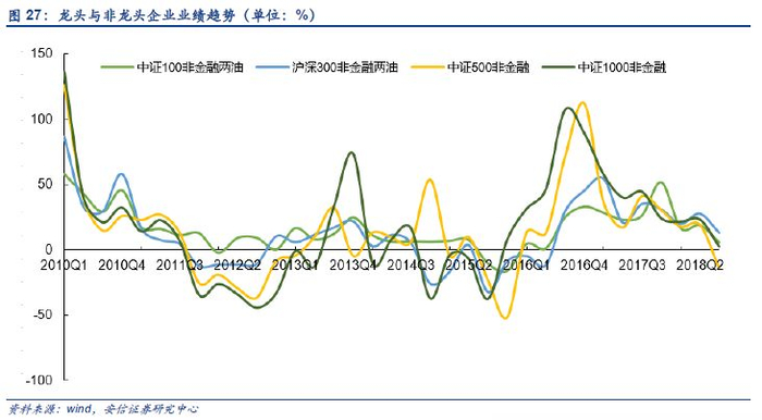 横向来看,作为龙头股的代表,中证100非金融两油和沪深300非金融两油18Q3的单季度归母净利润同比增速均超预期环比大幅下滑。中证100非金融两油的业绩从18Q2的18.83%减少2/3至18Q3的5.72%;沪深300非金融两油的业绩从18Q2的27.78%下滑一半至18Q3的13.21%。值得注意的是非龙头股以中证500非金融和中证1000非金融为例,两者18Q3单季度归母净利润同比增速分别为-13.73%(19.37%)和2.50%(23.27%),下滑幅度还是要远高于龙头股。