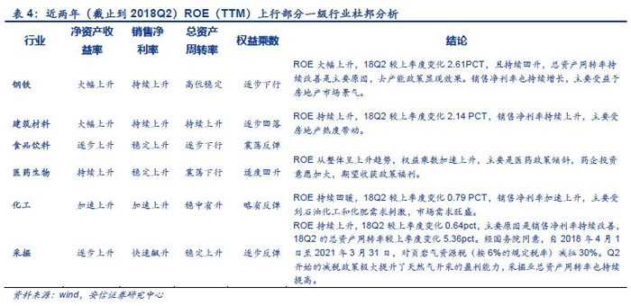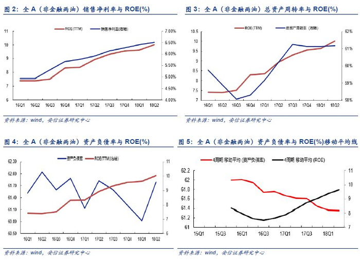 从杜邦分解的角度来看,A股ROE的提升主要得益于销售净利率和总资产周转率的提升,前者的作用会相对更大一些。近两年,全A(非金融两油)的销售净利率从4.93%一路上涨至18Q2的6.52%,涨幅为1.59pct,与ROE的相关性为0.98。总资产周转率从16Q1的0.60经历小幅下滑至0.58,随后上升并稳定在0.61,增长0.03(涨幅为5.17%),与ROE的相关性为0.84。值得注意的是,近两年资产负债率与ROE的变动呈现相反趋势,相关性为-0.35,具体来看资产负债率从16Q1的61.51%波动下降,18Q2的4周期移动平均资产负债率为61.24%,跌幅为1.22pct。从相关度来看,销售净利率对ROE产生较大的正面影响。