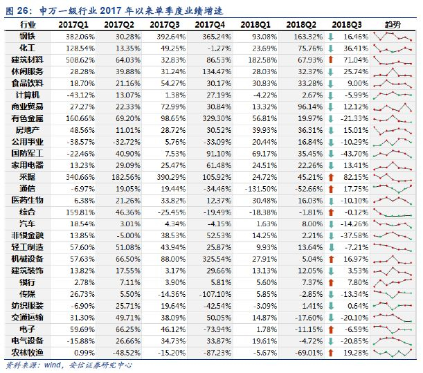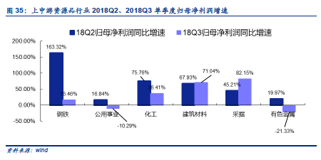 从已披露的所有2018三季度报业绩来看,18Q3单季度上中游资源品采掘、建筑材料行业盈利较2018Q2环比上升,钢铁、有色金属、化工、公用事业较2018Q2环比下滑。