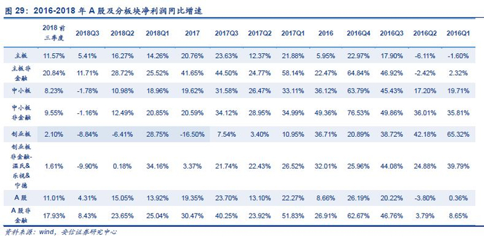 3.1. 板块方面:全A 前三季度归母净利润增速环比小幅放缓就目前已经披露的三季报来看,全A剔除金融后前三季度归母净利润增速为17.93%,较上半年(22.01%)出现较大下滑。其中,Q3单季度全A剔除金融后归母增速同比为增速为8.43%,较2018Q2(23.66%)出现下滑。中小板盈利增速均较Q2下降,创业板(剔除宁德时代、温氏、乐视)盈利增长则出现明显放缓。