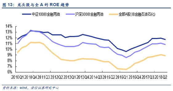 从指数层面来看,核心指数成分股ROE呈现下降趋势。以中证100非金融两油和沪深300非金融两油为代表的龙头股ROE从2016Q2开始一路上涨,分别从9.63%和8.57%上升至18Q2的11.93%和11.08%,随后18Q3结束九个季度ROE连续上涨,分别下滑至11.70%和10.83%。