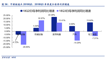 从已披露的所有2018三季报业绩来看,18Q3单季度中游制造业中电气设备、汽车、轻工制造和家用电器业绩有所下降,机械设备有所增长。