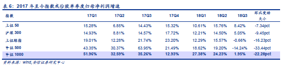 从指数成分来看,18Q3单季度上证50业绩同比增速最高,中证500环比Q2下降最为明显。上证50和上证综指18Q3单季度归母净利润同比增速分别为8.42%和-0.66%,环比18Q2的15.76%和15.57%大幅下降。其中,沪深300的归母净利润同比增速从18Q2的14.50%下滑至18Q3的5.05%,中证500则从19.20%下跌至-14.24%,中证500指数盈利下滑最为明显。值得注意的是Q3上证50业绩增长最高,在剔除金融以后,上证50增速仍然能够维持在25%以上。