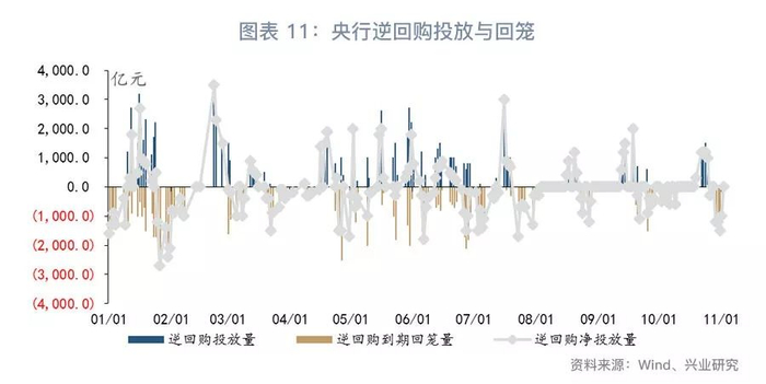 考虑到10月末财政支出力度较大,且11月初资金需求回落,央行未进行公开市场操作(图表10)。截止上周末,逆回购余额下降至0(图表12)。