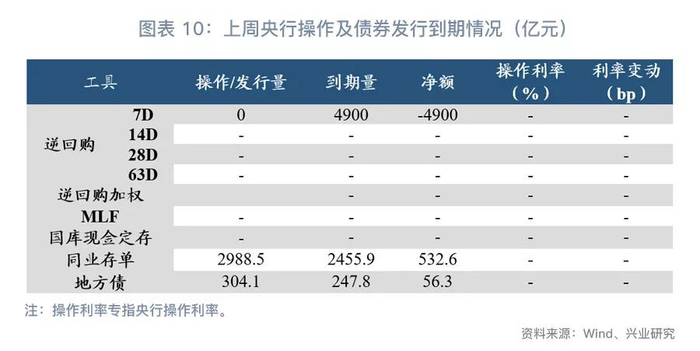 由于月末财政支出力度较大,上周央行未进行逆回购操作,合计净回笼4900亿元。