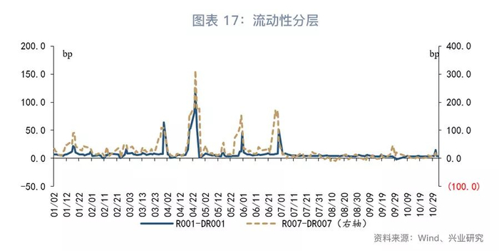 第三,流动性分层的角度(图表17)看,上周流动性分层有所扩大。上周R007与DR007的平均利差上升至8bp,较前一周上行约3bp。