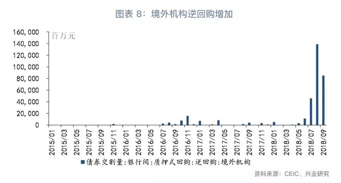 资金供给方面,正如上文所述,当人民币贬值预期较强时,跨境贸易企业可能将离岸人民币资金输送至在岸市场,增加在岸人民币资金供给。同时,境外金融机构也有动力将离岸人民币转移至在岸。数据显示,2018年6月以来境外机构在银行间市场的逆回购规模大幅增长。