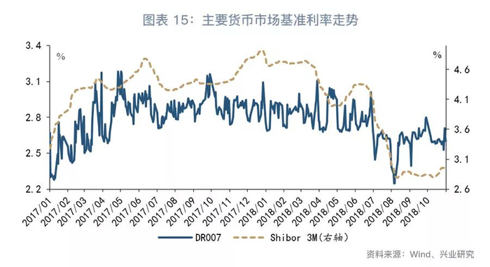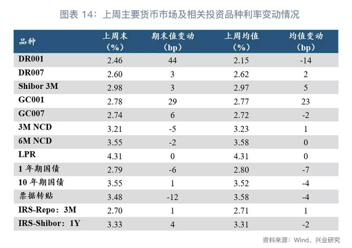 第一,从绝对水平来看(图表14),上周资金利率波动加大。以货币市场基准利率来看,DR007上周末利率水平为2.60%,较前一周末上行3bp;Shibor 3M上周末利率水平为2.98%,较前一周末上行3bp。