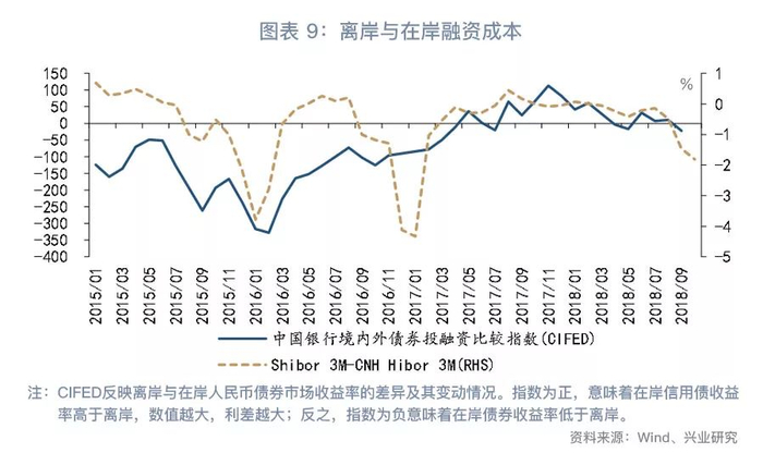 资金需求方面,当离岸人民币流动性相对紧张时,企业在离岸人民币市场融资的成本更高,部分融资需求可能从离岸人民币市场转向在岸人民币市场。我们可以通过CIFED指数观测在岸与离岸人民币债券融资成本的变化。CIFED反映离岸与在岸人民币债券市场收益率的差异及其变动情况。当CIFED指数为负时,在岸人民币债券收益率低于离岸。2015年离岸人民币流动性趋紧,Shibor 3M与CNH Hibor 3M之差逐渐收窄并转负,带动CIFED指数下行,企业在岸人民币融资成本相对更低。2018年7月以来,Shibor 3M与CNH Hibor 3M之差下行,CIFED指数也在2018年9月转负,反映企业在岸融资成本低于离岸。因此,部分人民币融资需求可能从离岸市场转移到在岸市场。