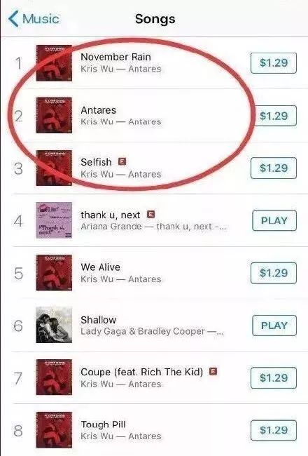 本月2日起,iTunes美国区音乐榜上一个鲜少出现的名字异军突起——Kris Wu。直至4日,这位“新人”三首歌曲居然将此榜单榜首常客、美国知名歌手“A妹”爱莉安娜·格兰德的最新单曲挡在三甲之外——也就是说在美国,他的新专辑下载量力压A妹、Lady Gaga以及皇后乐队。