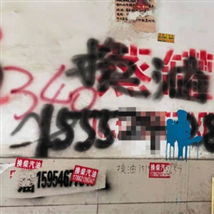 记者调查中,发现在山东很多地炼厂附近的公共厕所或路边建筑,都贴满了换油的名片,有的墙上也用油漆喷满了换油电话。