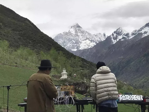 海拔3600米处,两位电子音乐人HWA与L+R-王璐的现场吸引了一小群年轻人的加入。但镜头语言告诉我们,他们的主要观众其实是对面白雪覆盖的四姑娘山。直播肯定不是观看现场的最佳方式,扁平的屏幕降低的维度没办法弥补。