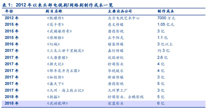 值得注意的是,影视制作成本不断攀升让制作方苦不堪言。根据猫眼数据,2012年的《甄嬛传》公开制作成本仅7000万元。