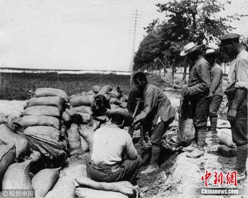1918年,法国阿拉斯,中国工人在搬沙包。图片来源:视觉中国