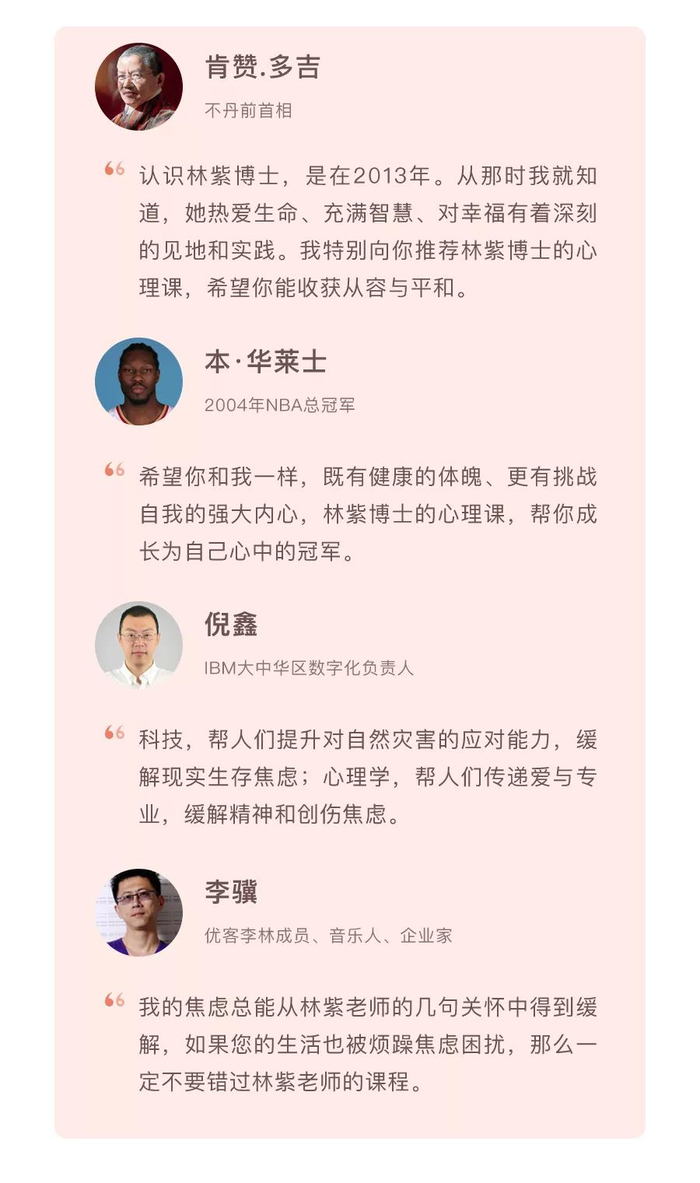 为此,正商课堂特联合壹心理,邀请专注心理咨询20年的林紫老师,开设《林紫的100堂心理学课,过不焦虑的人生》一课。课程是老师20年心理咨询工作,接待过10000+来访者,做过20000+小时个案咨询、800小时的团体辅导、3000多小时授课的全部实战经验与心理知识的结晶。