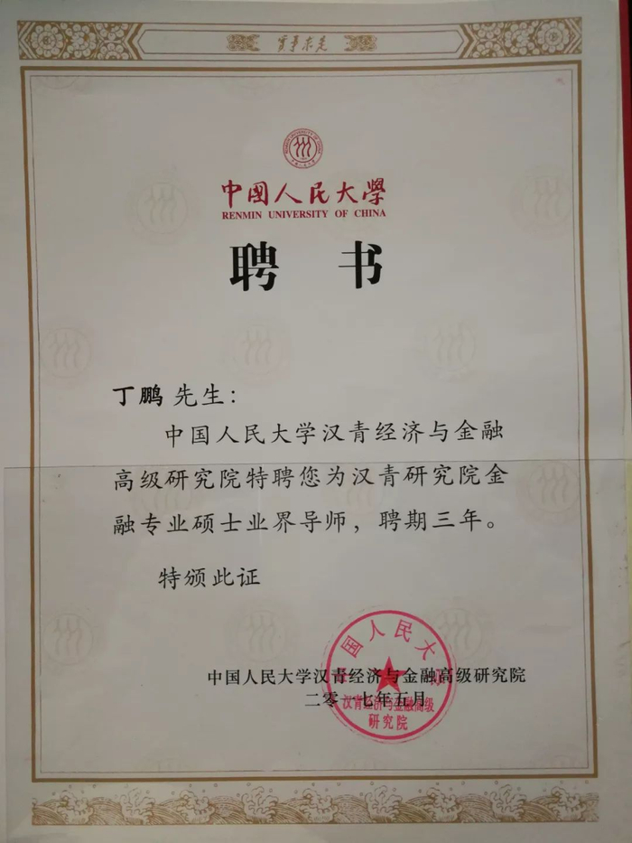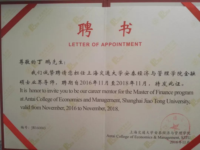 同时也在国内多个顶级大学开设专业课程和讲座,先后被聘为中国人民大学、上海交通大学金融硕士业界导师,做一些研究生的课程。