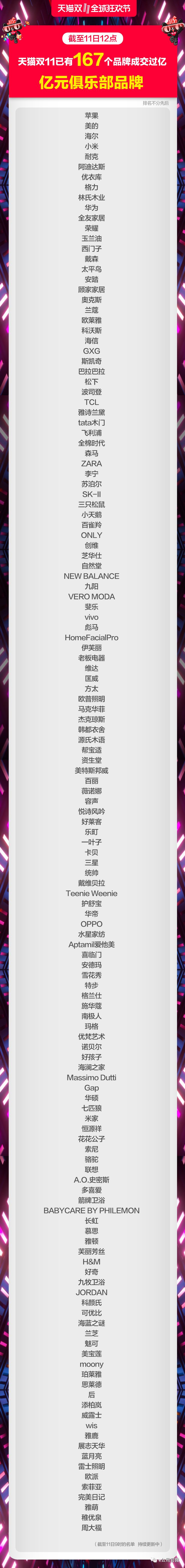 值得注意的是,截至今天中午12点,天猫双11已有167个品牌成交过亿。
