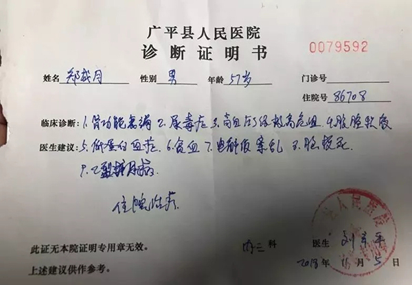 诊断书显示他有9种病:肾功能衰竭、尿毒症、高血压三级极高危组、腹腔积液、低蛋白血症、贫血、电解质紊乱、脑梗死、乙型糖尿病。