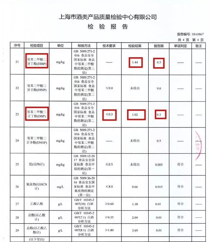 据报告,西凤年份酒的邻苯二甲酸异丁酯(DIBP,俗称“增塑剂”)检测结果为1.44mg,报告为限值0.5mg;邻苯二甲酸二正丁酯(DBP,俗称“塑化剂”)检测结果为1.02mg,对应限值为0.3mg。两项塑化相关化学添加剂的含量均接近限定标准的三倍。