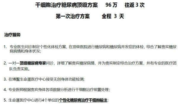 其中,“干细胞抗衰老综合治疗方案”和“干细胞治疗糖尿病方案”的报价从29.8万元/人至96万元/人不等。以所谓的“干细胞治疗糖尿病顶级方案”为例,该方案总价96万元,客户需往返3次,干细胞输注方式为静脉注射。