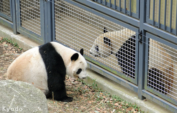 隔着栅栏相亲的力力(右)和真真(2014年3月13日,上野动物园,东京动物园协会供图,Kyodo)