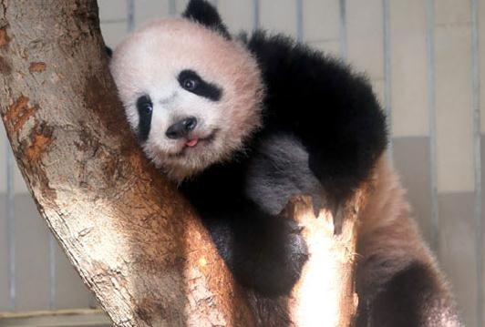 香香爬在树上顽皮地吐出小舌头(2017年12月18日下午,上野动物园)
