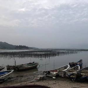 (海岸上渔网中塞满了打捞上来的海蛎,已经无人问津。)