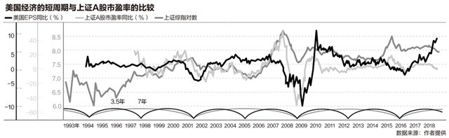 我们把中国A股市场在挣扎的原因归咎于中美经济周期的纠缠。中美经济存在明确的短周期。在周期运行的时候,大量经济变量之间同时地、有规律地波动,并在经济运行的轨迹中引起潮起潮落。我们用计量经济学定义了美国的3.5年和中国的3年经济短周期。在图中,我们使用调整后的标普500指数每股收益来衡量美国经济的短期波动。图表分析显示,美国经济显然存在一个3.5年的周期。两个3.5年的短周期构成了一个完整的、从谷底到下一个谷底的7年中周期。