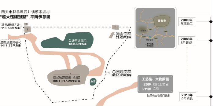 10月15日,西安电视台《每日聚焦》披露了该别墅更多细节:总圈墙面积9280.53平方米;建成砖混建筑1栋1层,面积517.29平方米;鱼塘两处,面积1098.68平方米;狗舍一处,面积78.03平方米;其他建筑3处,面积113.58平方米;通往各处道路及道路硬化1417.72平方米。