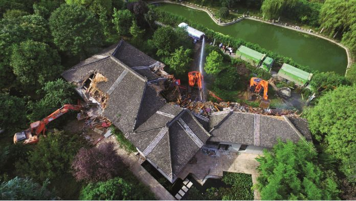50多天后,9月29日下午3时许,大型挖掘机、降尘车等器械开进蔡家坡村,这座存在了十年之久的超级违建别墅,走到了尽头。
