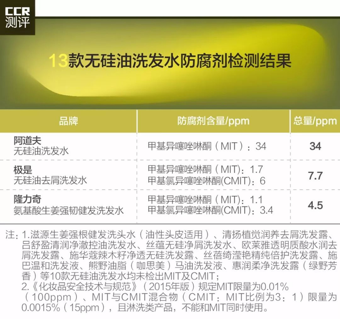 根据检测结果,3款检出MIT/CMIT防腐剂的无硅油洗发水中,除阿道夫无硅油洗发水,极是、隆力奇同时检出CMIT和MIT,总量分别为7.7、4.5ppm,且CMIT:MIT含量之比大致为3:1,因此可能添加的是防腐剂“卡松”,不过总量均未超过《规范》要求的15ppm。