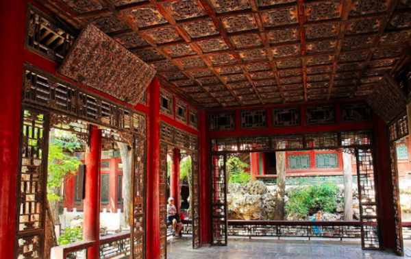 穿过衍琪门,走入乾隆花园的第一进院落,迎面就是假山,沿着曲折的小径,来到古木参天、山石环抱的古华轩前。曹雪芹从“开门见山”写到“曲径通幽”是大观园的开篇妙笔,《红楼梦》成书于乾隆年间,两者相互印证,可见这是当年颇为流行的造园手法。