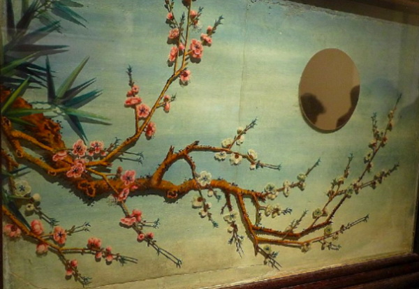 其中,萃赏楼二楼东次间内的隔扇,材质是紫檀的,边框是用湘妃竹拼接而成,窗户都是玻璃的,这在当时可说是极其的奢华。延趣楼内的紫檀木框玻璃画三清图插屏,右上角为一圆形镜子既在画中代表明月,同时也是一面镜子。