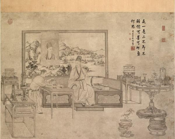 除了建筑的“致敬”,连画中的王羲之,乾隆也要模仿一番。《乾隆皇帝是一是二图》中,乾隆御题:“是一是二,不即不离。儒可墨可,何虑何思。长春书屋偶笔。”图绘乾隆皇帝身着汉人服饰,正在坐榻上观赏皇家收藏的各种器物。其身后点缀室内环境的山水画屏风上,悬挂一幅与榻上所坐乾隆皇帝容颜一样的画像。此幅构图是仿清宫旧藏的一开宋人册页,宋人画作画中人原是王羲之,乾隆皇帝得到后要求画家以他为模特,重新绘制了这幅画,画中人变成了乾隆本人。