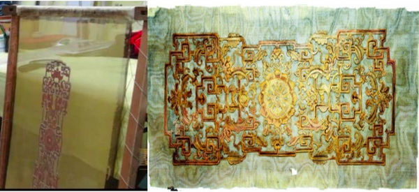 同样属于孤例的,还有在符望阁南侧的须弥座上的三槽漆纱彩绘夹纱隔扇。漆纱是一种满饰中国传统金箔的织物,在故宫建筑内檐装修,漆纱彩绘夹纱工艺仅此一处,漆纱外观呈均匀而稀疏的方孔状。漆纱彩绘夹纱正是利用了漆纱舒朗而周正的纱孔,达到隔扇通透而分隔的使用要求。漆纱是一种经纬纠绞交织并满饰中国传统金箔的织物,为了增加织物的挺括和平整,匠师于纱面上涂刷大漆满饰金层,更显它的挺固和娇艳。