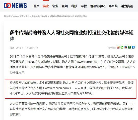 回应显示,多牛传媒与人人公司达成协议,战略并购人人网相关的社交网络、人人直播及增值业务。截至2018年3月31日,人人网社交平台的月独立登陆用户数约为3100万。