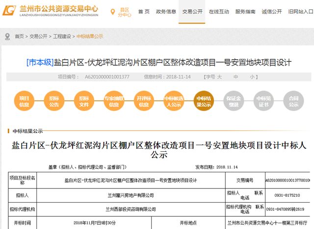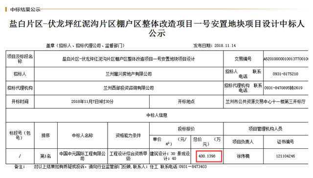 与此同时,2018年11月14日,兰州市公共资源交易局发布了盐白片区-伏龙坪红泥沟片区棚户区整体改造项目一号安置地块项目设计中标人公示。中国中元国际工程有限公司以400.1398万元获得中标资格。