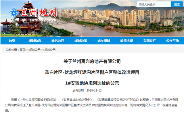 2018年11月12日,兰州市城乡规划局官方网站发布了关于兰州寓兴房地产有限公司盐白片区-伏龙坪红泥沟片区棚户区整体改造项目1#安置地块规划选址的公示。公示时间为2018年11月6日至2018年11月12日。