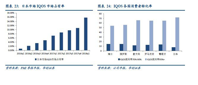 菲利普莫里斯国际目前已经在超过30个国家(地区)销售IQOS产品,在瑞士、俄罗斯、罗马尼亚、乌克兰、葡萄牙、德国、新西兰、加拿大等多国市场消费者中,IQOS的转化率均在50%以上。