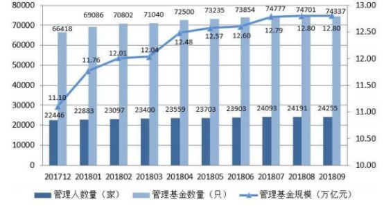 截至2018年9月底,中国证券投资基金业协会已登记私募基金管理人24255家,较上月存量机构增加64家,增长0.26%;已备案私募基金74337只,较上月减少364只,减少0.49%;管理基金规模12.80万亿元,较上月增加51.26亿元,增长0.04%。私募基金管理人员工总人数24.61万人,较上月增加142人,增长0.06%。