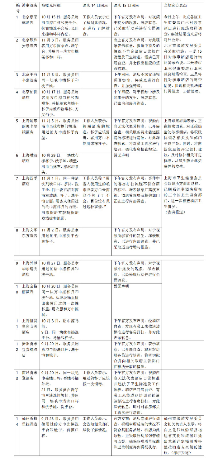 被曝光24小时后,14家酒店中已有12家作出回应。实习生 张慧 制