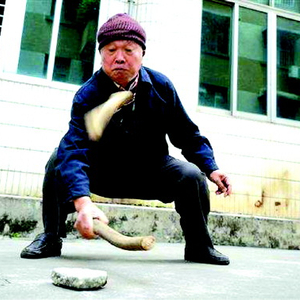 尜,也叫尜尜,其形状正如“尜”这个字一样,两头小,中间大,是一种男孩子爱玩的游戏物件。其制作过程十分简单:在直径三四厘米的杨木棍儿上取下约10厘米长的一小段,找出它的中间位置,然后从中间开始,用刀分别向两端砍削,使其两端都呈尖状,做成中间粗而愈向两端愈细的形状就可以了。做完尜,顺手砍出个几十厘米长的木棍儿(也叫“尜棍儿”),就可以游戏了。