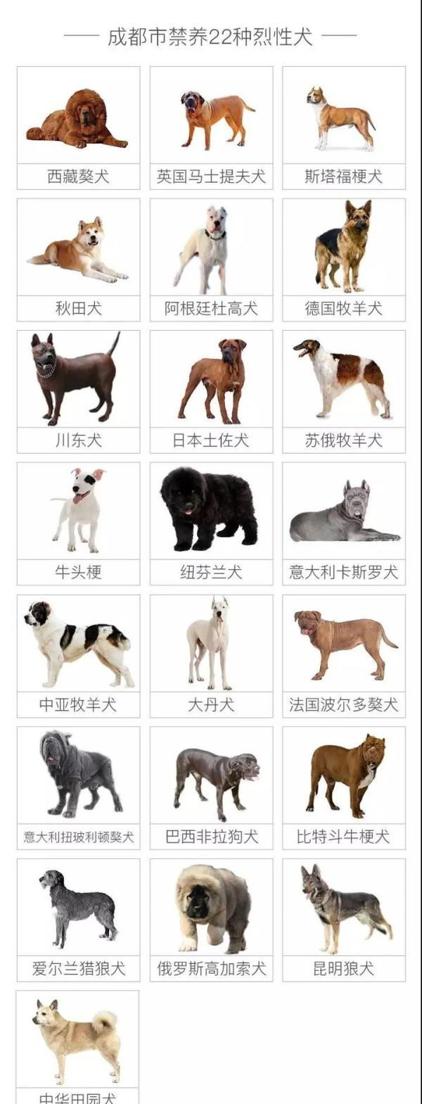 2010年颁布的《成都市养犬管理条例》,规定了22种禁养的烈性、大型犬只种类:比特斗牛梗犬、斯塔福梗犬、阿根廷杜高犬、巴西非拉狗犬、日本土佐犬、意大利卡斯罗犬、中亚牧羊犬、俄罗斯高加索犬、西藏獒犬、意大利纽玻利顿獒犬、法国波尔多獒犬、英国马士提夫犬、秋田犬、德国牧羊犬、川东犬(重庆犬)、牛头梗、纽芬兰犬、爱尔兰猎狼犬、昆明狼犬、苏俄牧羊犬、大丹犬、中华田园犬(土狗)。