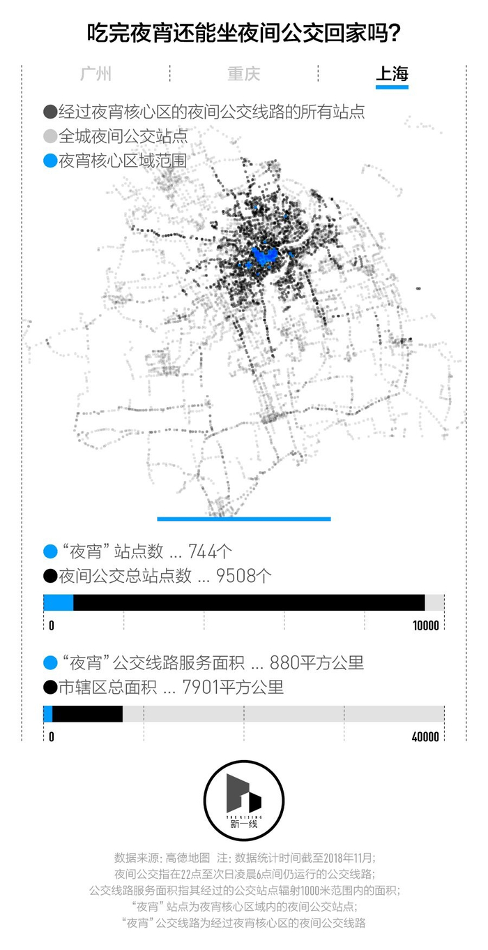 上海的夜间公交相对来说更加成熟和完善,但也只能够服务到十分之一的城市区域。此外,上海夜宵核心区的夜间公交站点数只占全城夜间公交站点总数的8%,夜间公交的配备对全城的所有夜间活动照顾得更好,对夜宵活动来说却相对较弱。