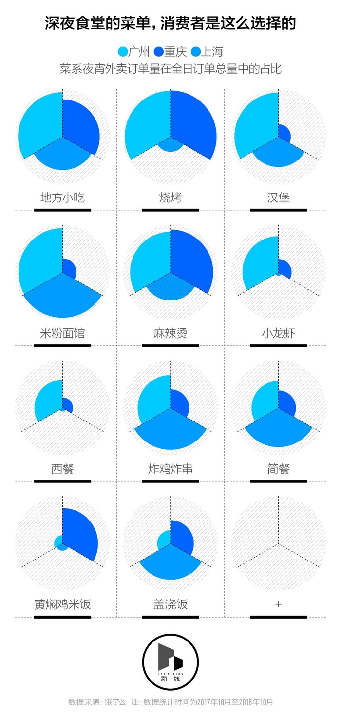 从上图中不难看到,广州、重庆和上海都有其各自的夜宵发展特征。