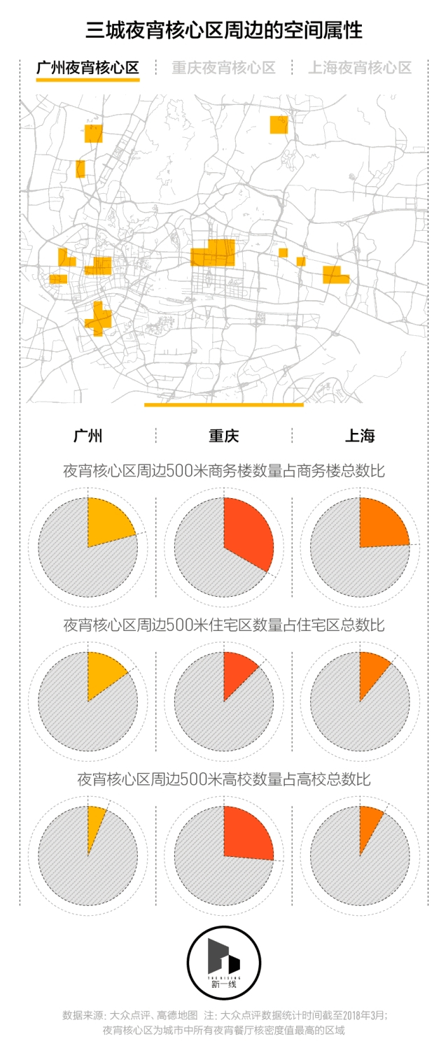 对于会前往餐厅吃夜宵的人来说,便利性是非常重要的决定因素。为此,我们将三座城市中夜宵聚集度最高的的夜宵核心区提取出来,以它们为中心,测算500米半径范围内都有哪些空间类型。这个数据显示了城市里的夜宵核心区的主要服务人群是什么样的。