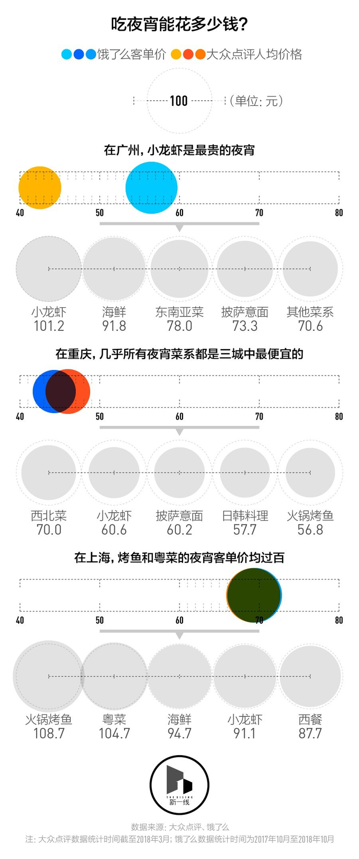 我们综合了来自大众点评的夜宵商家人均价格及来自饿了么的平均客单价,并且提取了在饿了么所有夜宵订单中订单单价最高的菜系,在三座城市之间做出对比。
