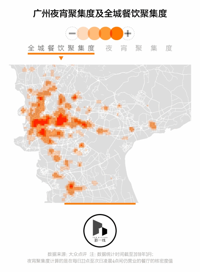 如果不局限于500米左右的步行距离,夜宵的选择自然会多很多,这也意味着夜间的交通服务需要足够便利。这里我们选择能够服务到22点至次日6点的公共交通线路作为分析对象,并计算了经过夜宵核心区1公里范围内的所有夜间公交站点,和这些公交线路在全城范围内所能辐射到的服务面积——这个服务面积算的是相关线路所有站点的1公里半径服务范围。