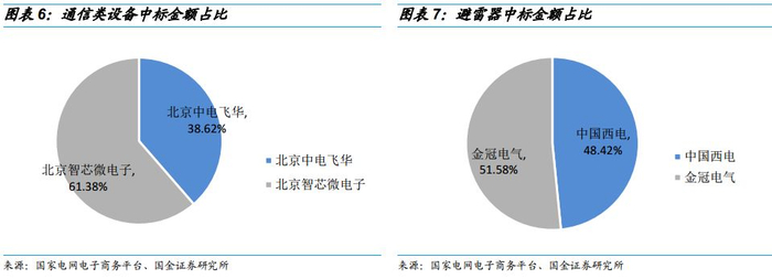 产品招投标金额占比第二的1000kV电抗器基本由中国西电和山东电力平分,中标份额分别为50.68%、49.32%;通讯类设备由北京智芯微电子和北京中电飞华中标,中标份额分别为61.38%、38.62%;避雷器设备由金冠电气和中国西电中标,份额分别为51.58%、48.42%。
